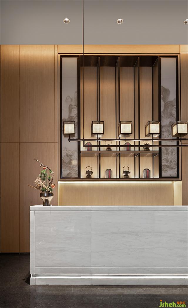 水吧区在极简的乳白色大理石台面融入了别具一格的中式陈设美学,使空间弥漫着简雅氛围。