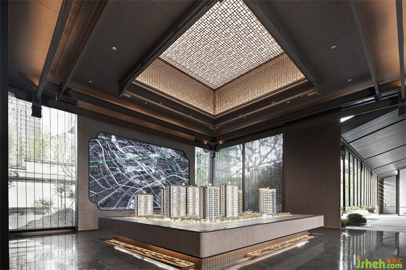 “中为适应之谓,庸为经久不渝之意”。沙盘展示空间采用 “四水归堂”设计,通过对“四水归堂”格局形制的钻研,会所设计将徽派传统民居建筑文化精粹与其融合,在一围一合之间,一庭一堂之内,以此体现中式建筑的“藏风纳气”理念。 在室内概括提炼中国古代传统纹样“万字纹”图形元素融入考究而克制的细节,寓意绵长不断和万福万寿不断之意。