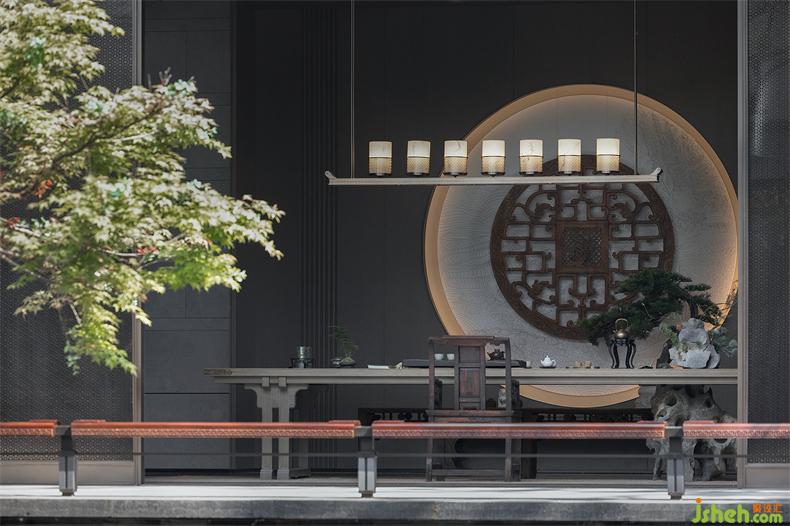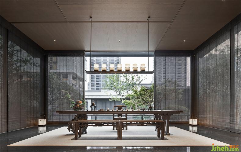 一缕茶烟透碧纱,享慧心之外的茶韵墨香。禅茶区还原宋茶席规制,会所设计在流淌的水镜中呈合围环抱之势,将东方意境恰到好处地彰显。天花采用万字纹的图形以现代手法构造,四面以金属格栅围合,以一种虚的“隔”的方式,传达出传统东方写意,也让当代气质呼应而出。在此茗一杯茶,捧一本书,晨沐朝霞,夜观星斗,咫尺乾坤尽在眼前。