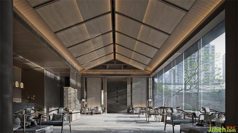 洽谈区的设计延续了东方的礼序之美,对称布局,一面是开阔的园林丛林景色,一面是丰沛的情境体验,共生平衡与和谐。会所设计天花以徽派传统建筑结构为原型,令空间多了些山峰傲骨的巍然气韵。