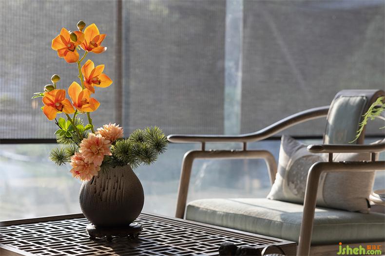 水吧台的墙面以门窗取景,与背景水墨画间相呼应,呈现“檐飞苑溪水,窗落敬山亭出”的写意画卷,会所设计搭配宋代中式简约的家具,令整体空间在统一和谐的基调中,散发出大气稳重的观感。