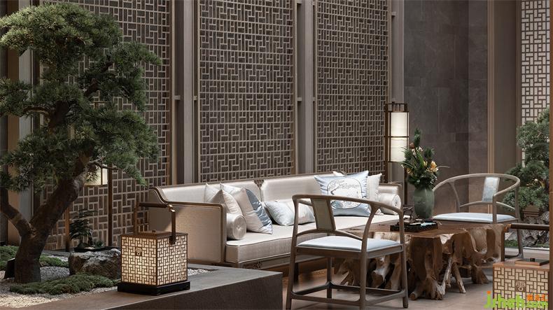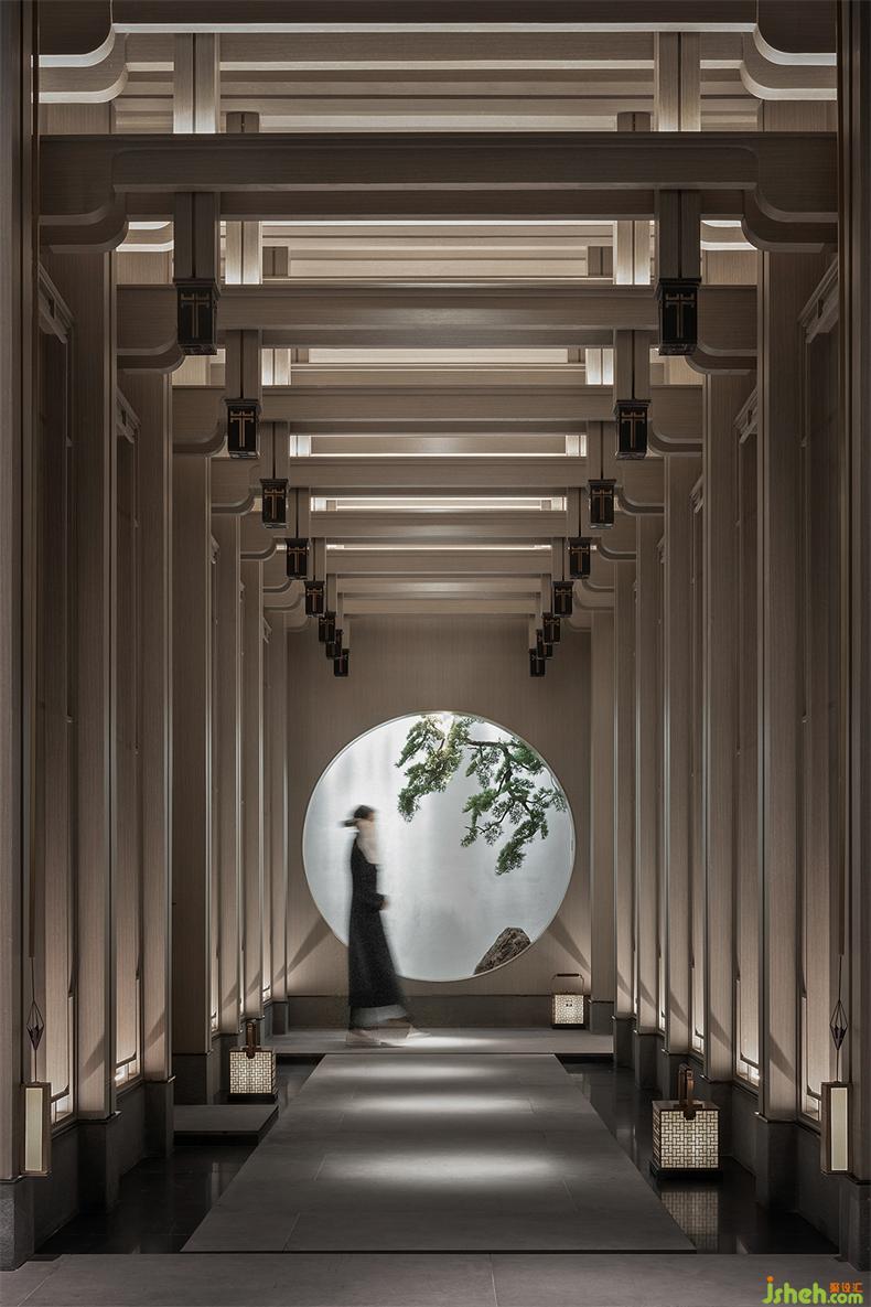 节奏与韵律可以激发起人们的美感联想,步入光影长廊呈现的是圆润如月的月洞门,暗含九九归一寓意圆满之意,会所设计以虚实结合的手法,材质与光影的动态产生交互,在月洞门下构成“框景”,凝结出一副“明月松间照,清泉石上流”的丰盈画面。