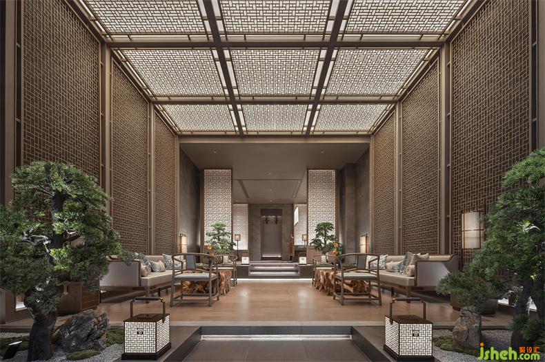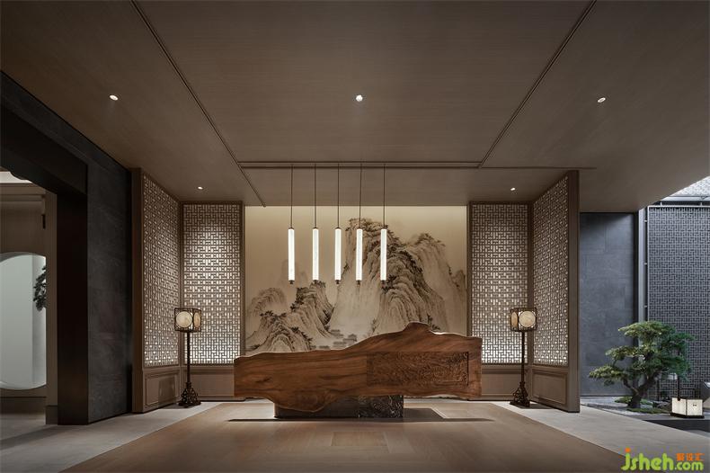 接待大堂整体温润开阔,接待台以质朴厚重的木头作为材料面,在屏风的映射下,散发出大气稳重的观感。