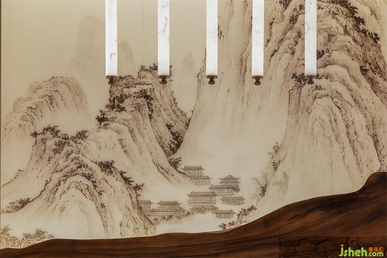 步入地下会所前厅,以台阶形态为媒介,结合空间框架及功能进行设计,会所设计用简洁的体块贯穿延伸于整个空间。楼梯两侧是由水纹灯与夹丝玻璃构成的山间清泉流水画境,用非水之水,作微波水漾,在光线下更显动人灵光。万字纹下的格栅屏风渗透出影绰的竹林清风,透光幽静,增添不同层次的感官体验。