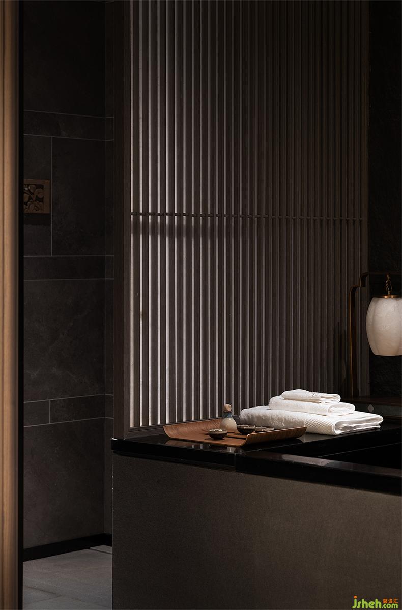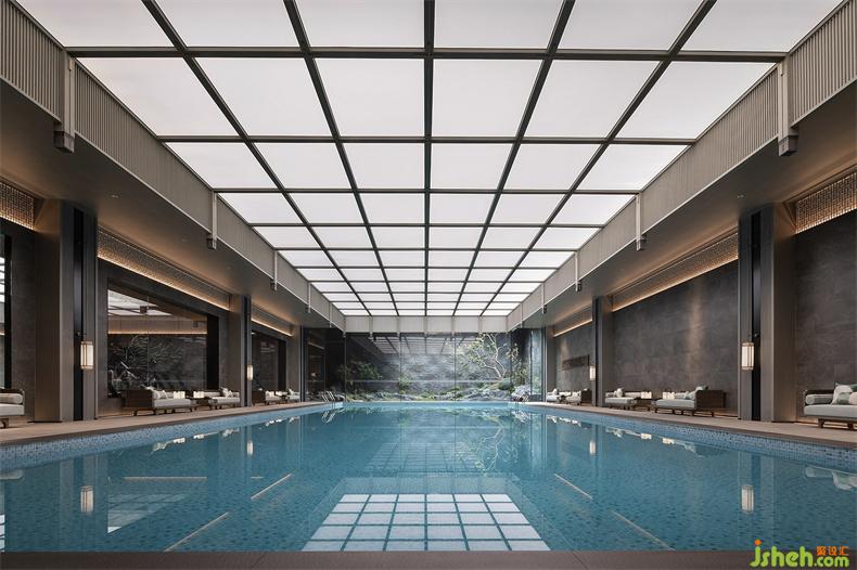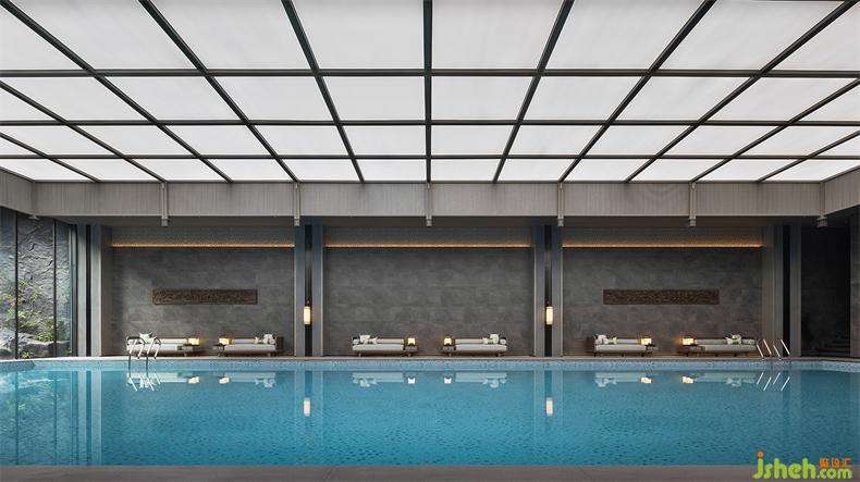 泳池区以建筑结构之形,构空间之意,光影与建筑两相融。会所设计大体块的灰色石材和线状木质格栅,组成线与面的节奏变化,体现了空间的简洁和张力。