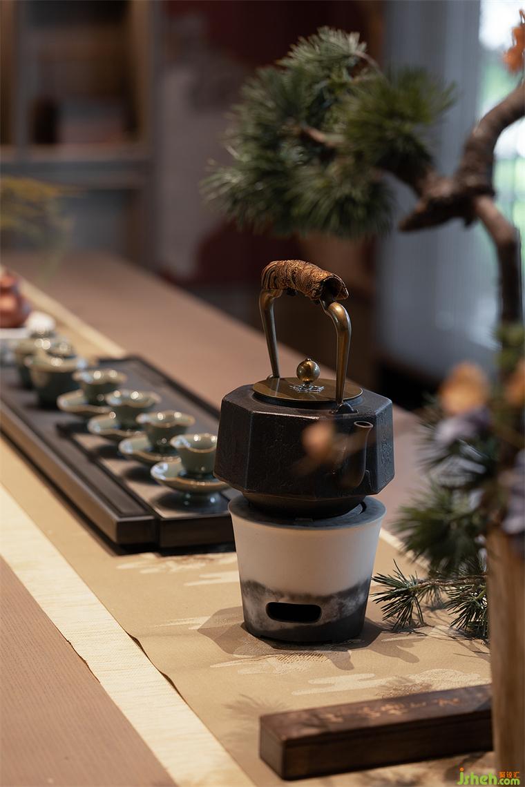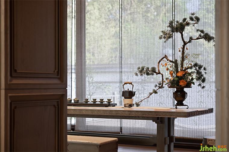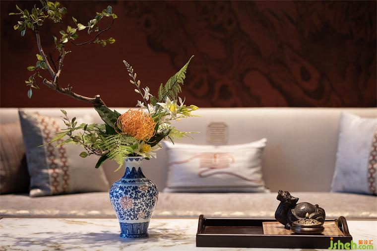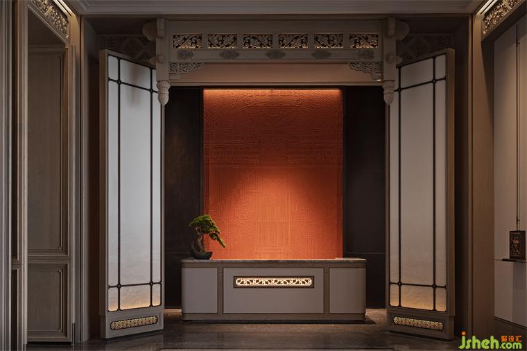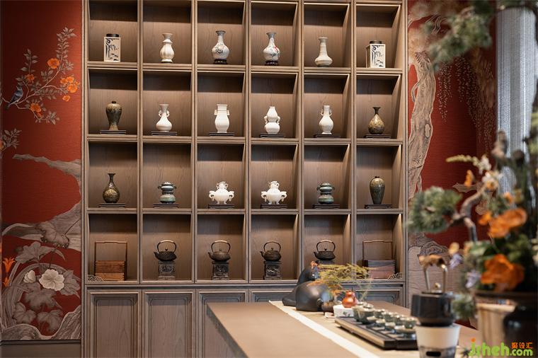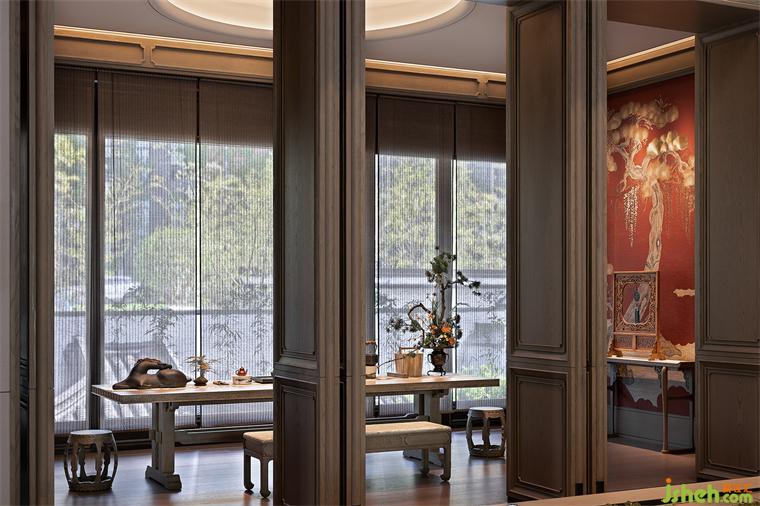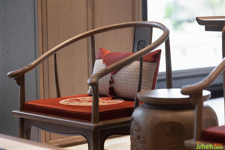 洽谈区的设计延续了空间的礼序之美,搭配宋式家具,长沙会所设计营造家的真实感受和舒适商谈氛围,光影交错下,一抹中国红的柜体,作为跳跃色点燃空间情绪,传达着当代中式美学的奢华。