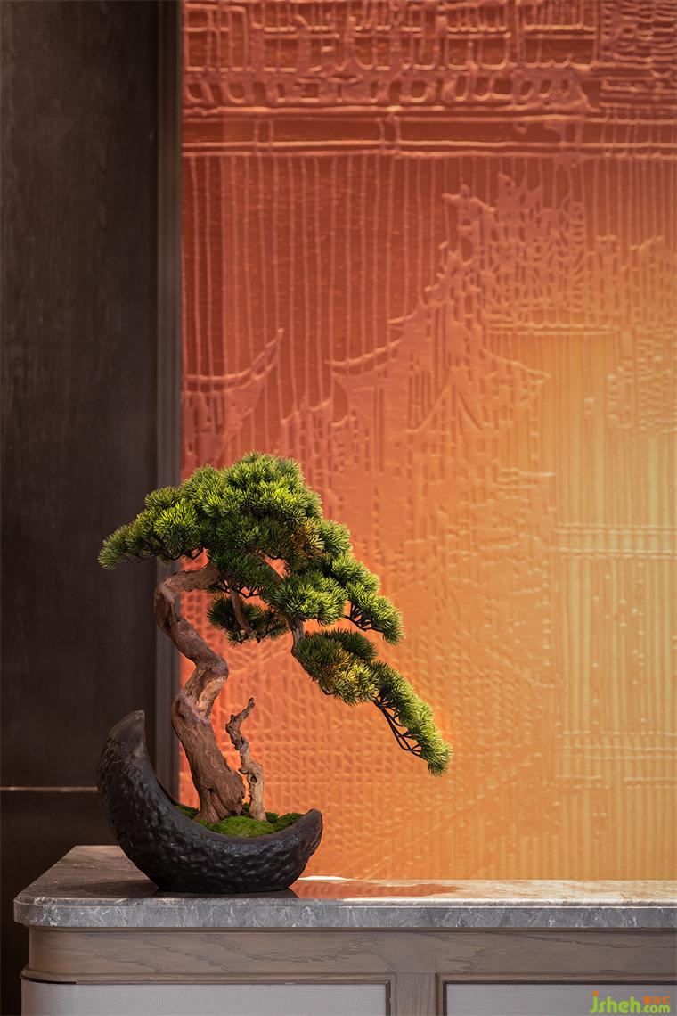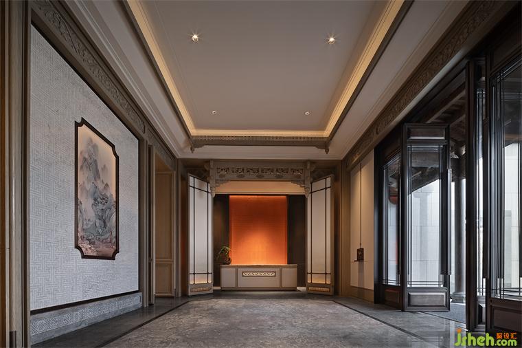 节奏与韵律可以激发起人们的美感联想,步入光影长廊材质与光影的动态产生交互,长廊中的地砖由中国传统燕尾锁落得到灵感和启发,整体空间隐含了徽派建筑的结构布局。两侧引水景穿插,长沙会所设计中式方形灯笼饰于长廊之内,一道云纹的石桥序列其中。整体以含蓄的现代方式诠释东方意境,陈设置景,简凝诗意。