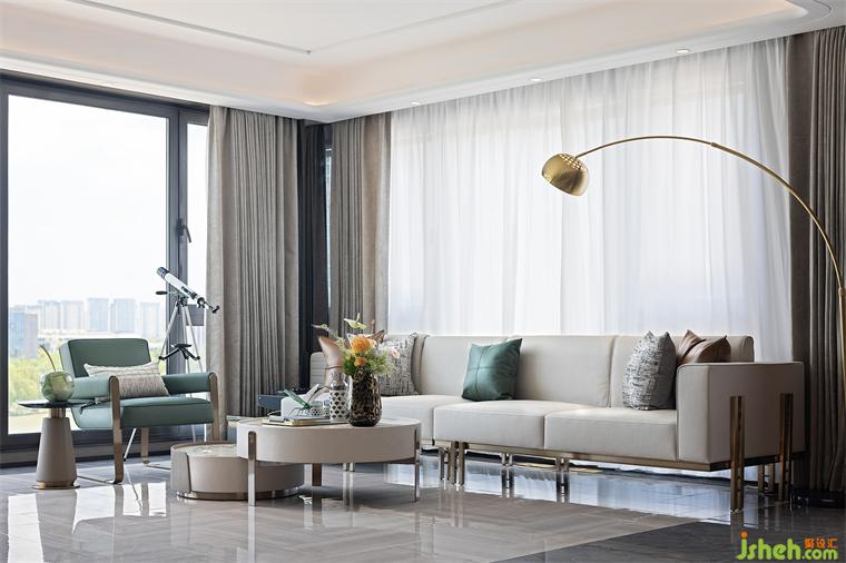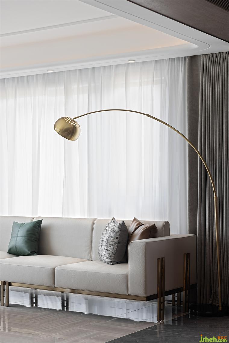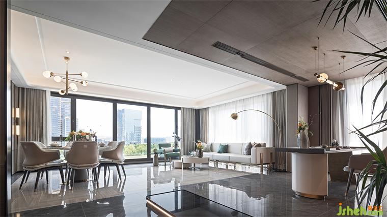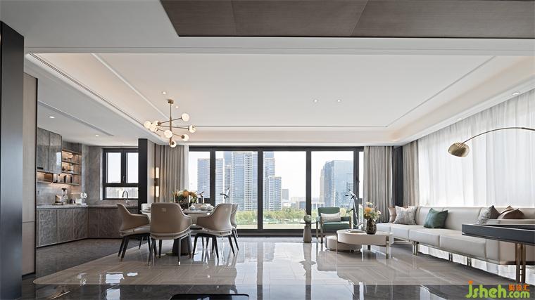 客厅布局打破常规的空间界限,样板房设计强调空间线条感与生活功能性的思考,客厅、餐厅与工作区融合实现多场景对话打造生活空间,以连贯的手法和语言造型呈现,向内外延伸。开放式的格局,让空间更为宽敞通透,营造舒展的氛围。