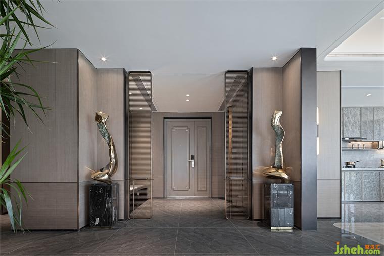 初入玄关格栅按比例分割拓展了纵深方向的空间叙事穿插肌理感图案