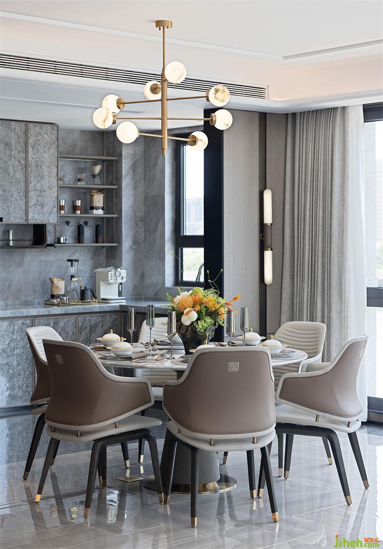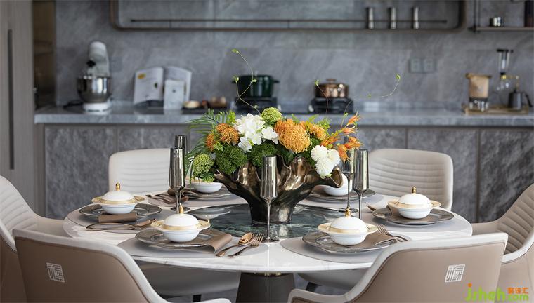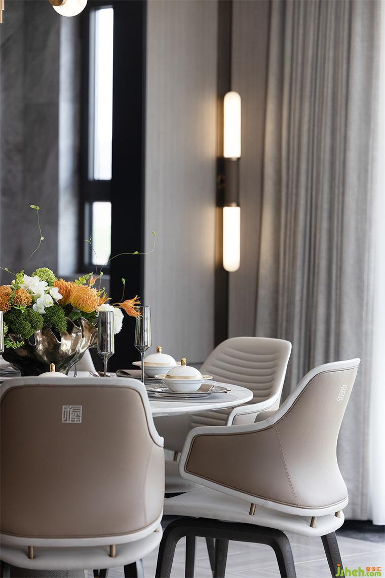 餐厅空间延续着客厅空间所营造的静谧自然与清雅。样板房设计雅致的色彩感还原生活最本真的模样,花器为整个空间带来了不可多得的呼吸与律动感,自在且随心。