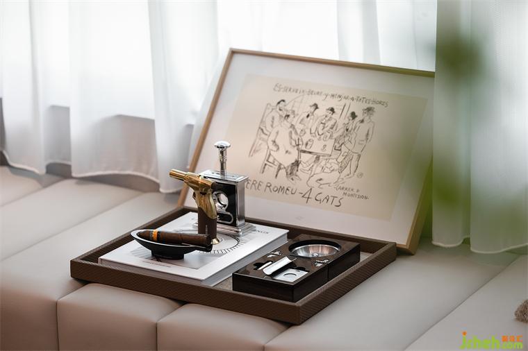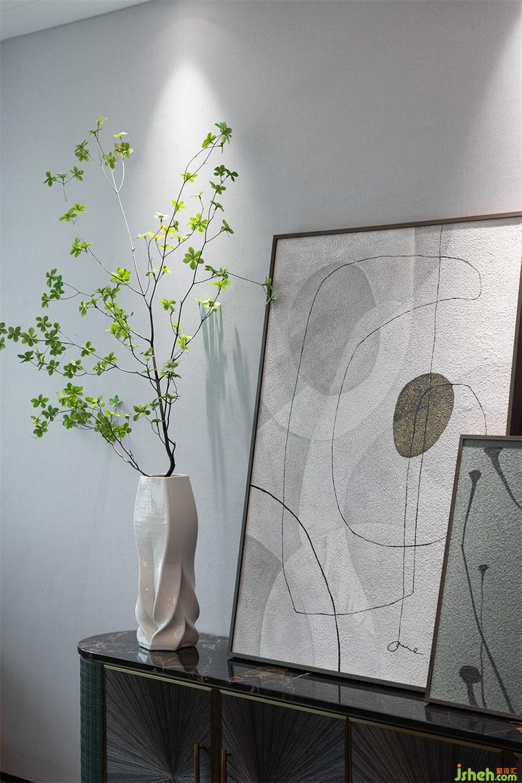 在家具的选型上突出品质感,陈列的装饰品则突出精致的艺术感。样板房设计巧思之下,不管是自然的叶子还是艺术品都是富含着强烈人文气息的存在。