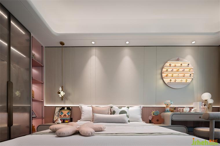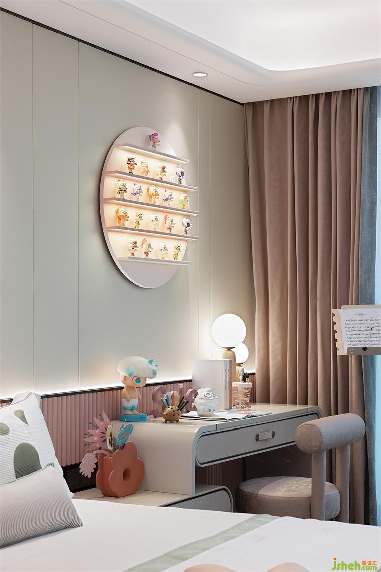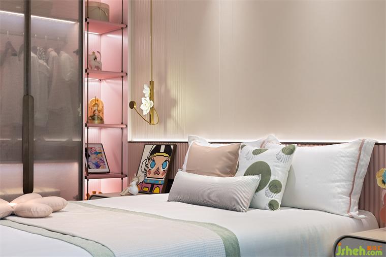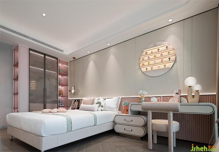 女孩房的色彩趋于柔和甜美。样板房设计百搭的中性色辅以充满无穷魅力的粉色,让整个居室的氛围都变得浪漫且柔美。