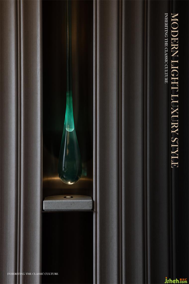 With the help of natural rhythm, the design seeks a flowing and eternal balance, and lets the art naturally reveal through the elements of mountains, water, waves, etc. The porch sculpture takes the shape of water, bringing a sense of spirituality to the space; The living room sculpture chooses a relatively simple and delicate shape, taking mountains and rivers as the shape and natural green as the color; At the same time, it can also echo with the green stone of the TV wall. An open living space that presents the modern luxury and elegance spirit, and feels the beauty of urban life through artistic departure and integration.