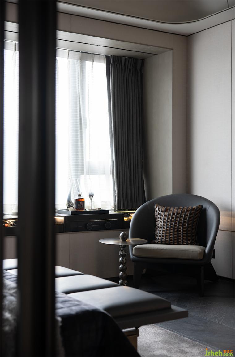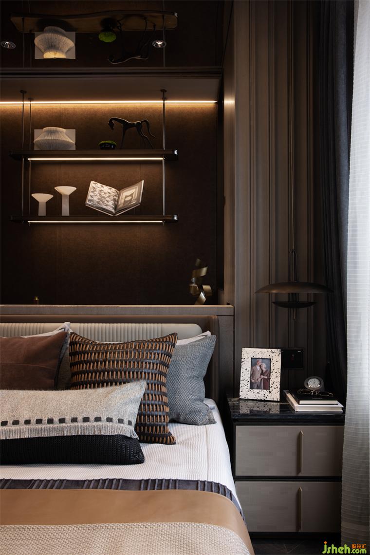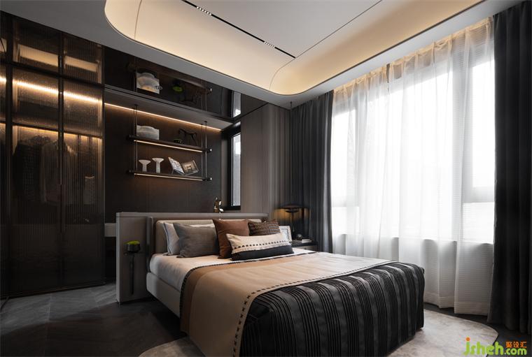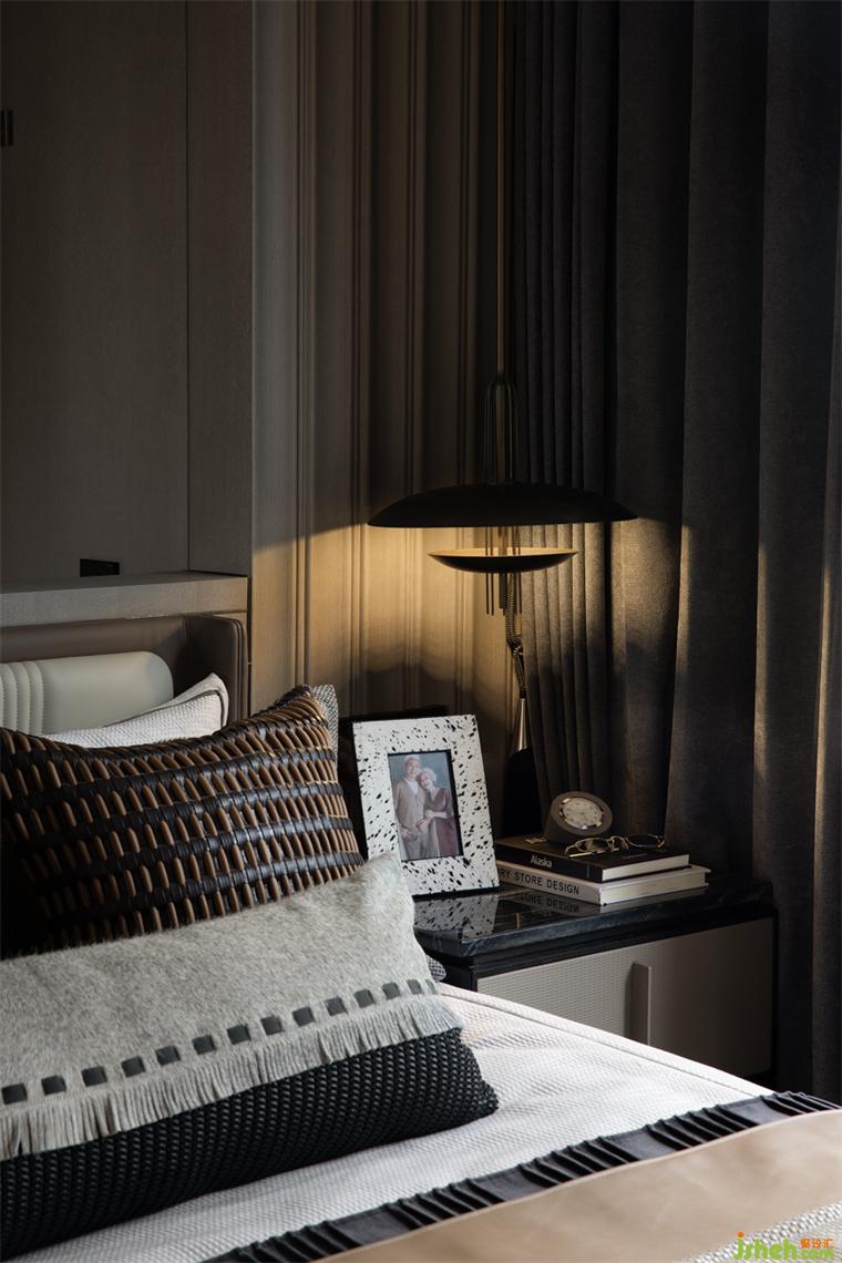 次卧的设计,静谧舒雅。佛山样板房设计以沉稳的奢雅颜色、简洁的线条与材质,渲染出一片安宁之境,低调却尽是优雅惬意。流露出岁月的宁静。