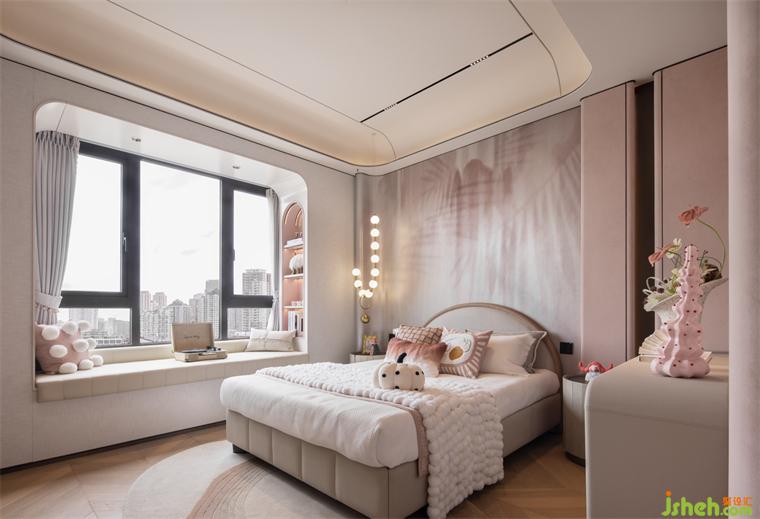 女孩房以功能区间的和谐布局,搭配樱粉色调的调染笔触样板房设计,凸显女孩房的温馨和浪漫的氛围,佛山样板房设计赋予女孩房一种审美想象的启蒙,烘托孩子的本真、纯粹与美好。