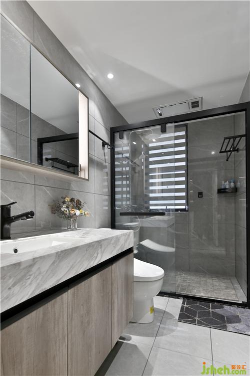 主卫生间干湿分离,淋浴房四边走水设计,形成中间凸起,四周下凹的形状,起到排水快的作用。中间整块大理石拉槽,防滑安全。浴室柜选择的是一体柜,下面是悬空设计,方便打扫。浴室镜子有除雾功能,还有有露有藏的储物功能。