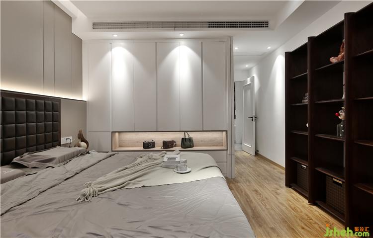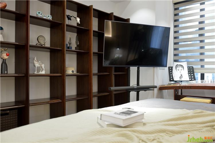 业主有一些自己喜欢的软装摆件,所以床对面设计了一个开放式储物柜,可以摆放自己的心爱的收藏品及经常用的生活用品。