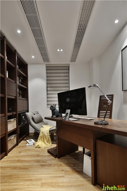 书房的书柜设计做到有藏有露,既有层次感又方便收纳。窗帘设计的是百叶窗,方便通风。