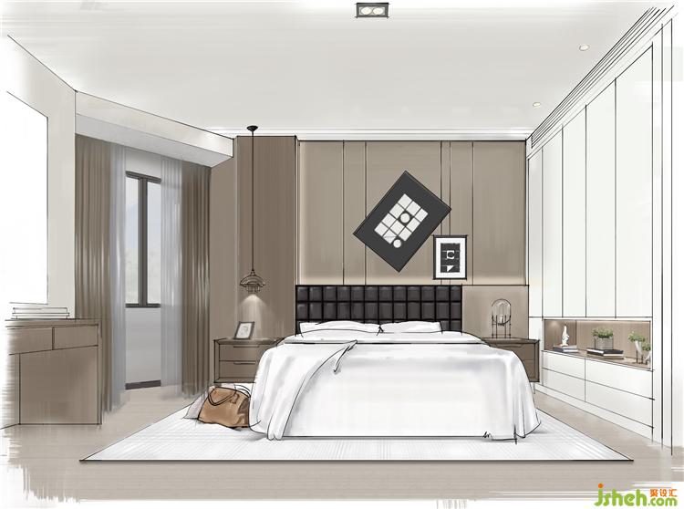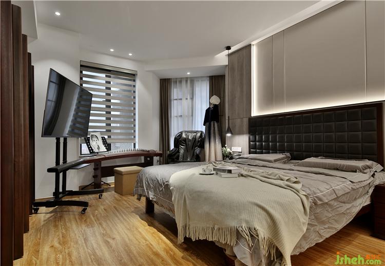 主卧用了一些木纹色,提高色彩饱和度,让人更容易放松。家具用的也都是楷模的。