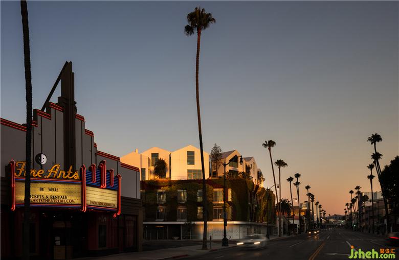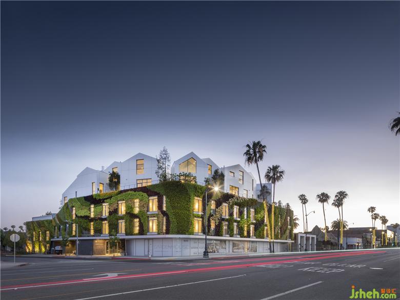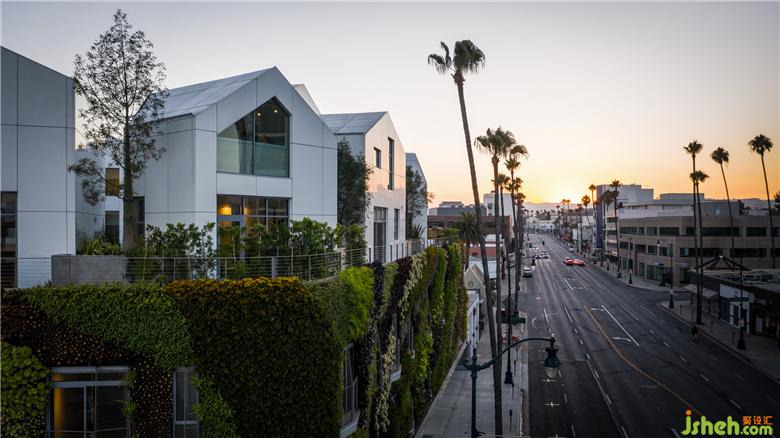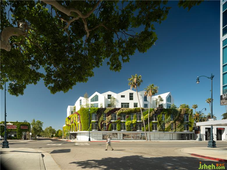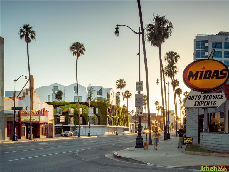 建筑的立面被葱葱绿植覆盖。在常年干旱的南加州,选择如仙人掌、多肉、藤蔓等本地耐旱植物,适应当地气候,无需过多浇灌和维护即可蓬勃生长。植物本身形成建筑立面独一无二的肌理,在比弗利山市规范、整洁、一丝不苟的社区环境注入有机自然,显得清凉且亲和。项目建成后,即成为了美国境内面积最大的绿植外墙。