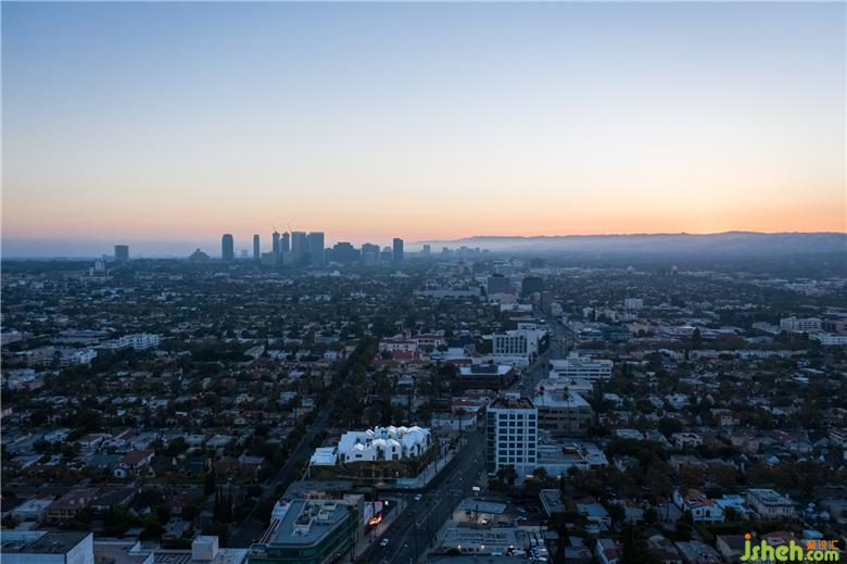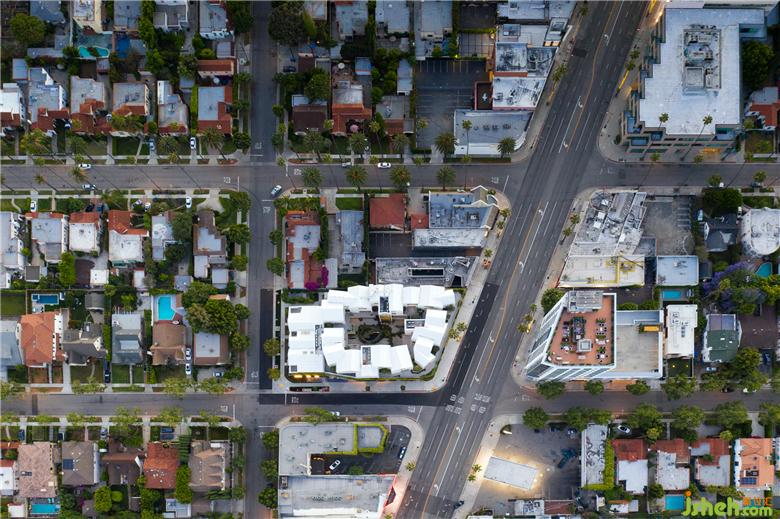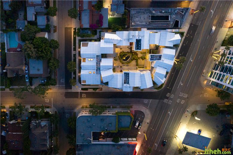 “山丘庭院”是一个混合功能项目:一层是临街商业,18个公寓单元此起彼伏生长于绿色平台之上。层叠的白色立面、尖屋顶,和不规则的窗试图在用交错的直线条描绘出动态的画面。将洛杉矶标志性的山庄,在城市环境中复制,再在“山坡”上建立小村庄。这个画面就像卡通一样的直接和天真,甚至有些幽默。会所设计
