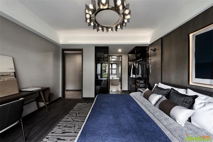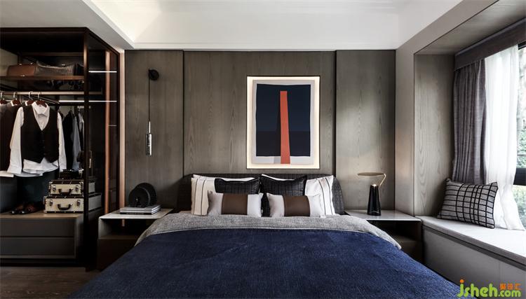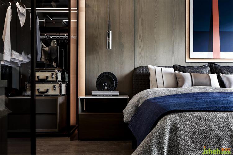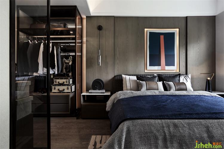 主卧床头背景墙由大小不一的木饰面板组成,清晰的肌理纹路浑然天成,给予空间温暖的触感。广州亚运城精装样板房设计烟灰色玻璃衣柜质感透明,分区明显,内藏衣物饰品一目了然,拿取便捷。