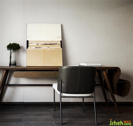 餐厅选用大面积的木饰面作为背景墙,木质台面餐桌与深绿色皮质餐椅,广州亚运城精装样板房设计延续了客厅的风格基调, 一脉相承又自成韵味。一家人围绕而坐,灯光下谈天说地,共享美味佳肴,简单温馨,最有幸福感的生活,莫过于此。