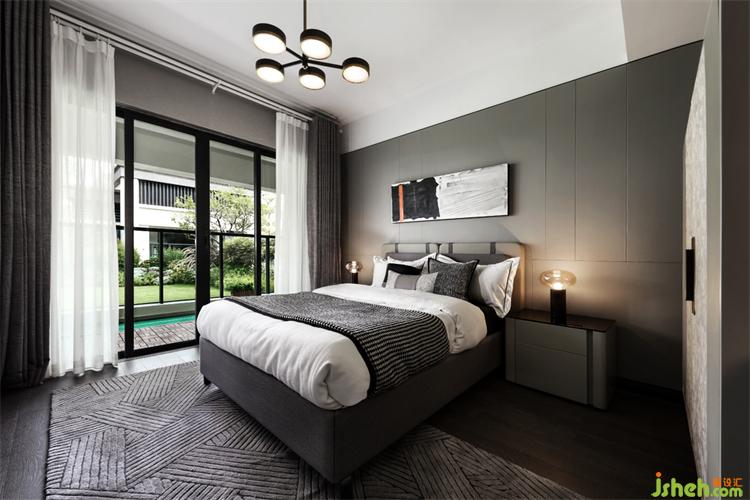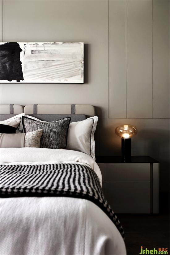 老人房的设计注重简约,空间不着一丝华而不实的赘饰,墙体,衣柜,床品,地毯一律选用沉静内敛的黑白灰色调,唯一亮眼的色彩来自装饰画上的一抹橙色,巧妙地打破了沉闷,两侧的床头灯泛着淡淡的微光,温和的光线不仅能有利入眠,也方便老人家夜起。