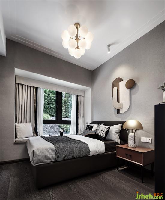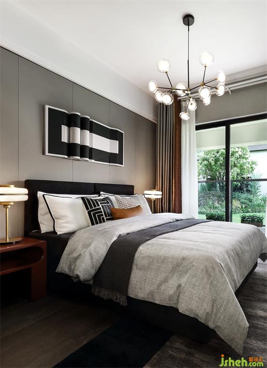 次卧沿用现代灰的主调,辅以暖棕色进行调和,将低奢与高贵完美融合,消除了灰色带来的冷感。墙面上黑白相间的装置画宛若一幅徐徐展开的画卷,远看又仿似轻轻波动的水纹,藏着无尽的浪漫与诗情画意。