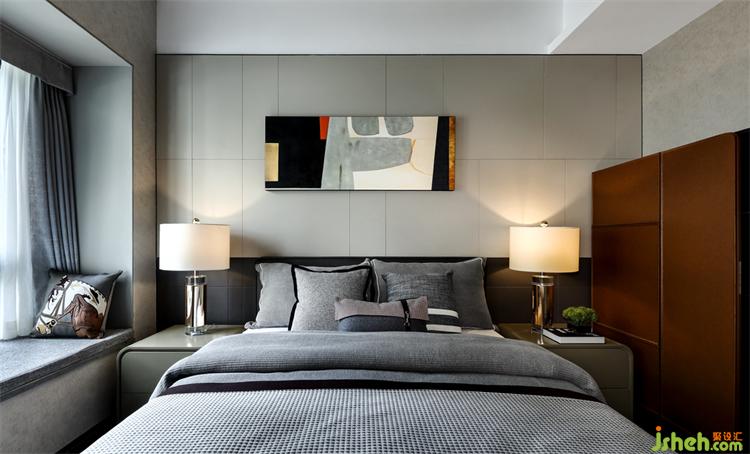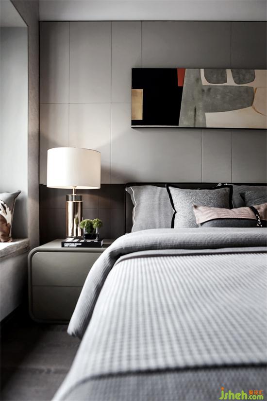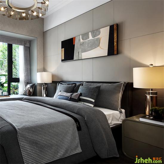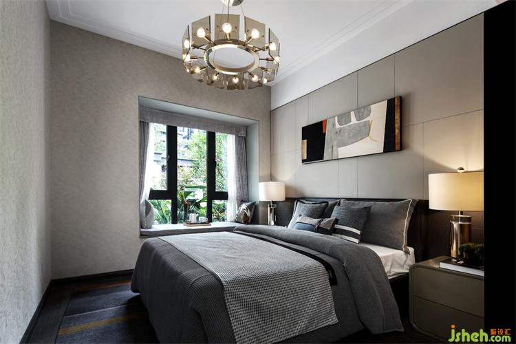 老人房以浅灰为主色,相较于主卧气质更显雅致,简洁,给人一种宁静感。广州亚运城精装样板房设计床头灯柔和的光线照射在素雅的墙面上,平添了几许温馨,天花低垂的黄铜吊灯,自带高级感,提升了整体的气质,是卧室的点睛之笔。