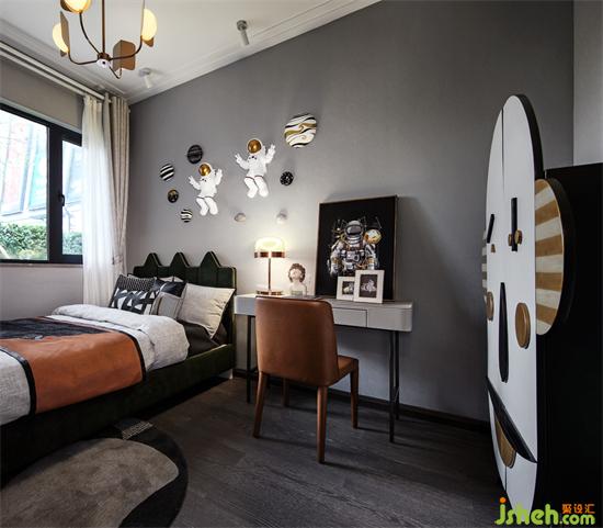 儿童房设计以太空遨游为主题,墙面上散布着的装饰品就像浩瀚宇宙中大大小小的星球,中间的太空人公仔十分的俏皮可爱,仿佛穿上一身航空服,便能跟随它们去往星际探险,衣柜也挑选了符合孩子烂漫天性的样式,设计师将童趣、想象、科技融合于一室,打造出一个可以自由畅想的小天地,为孩子种下梦想的种子。