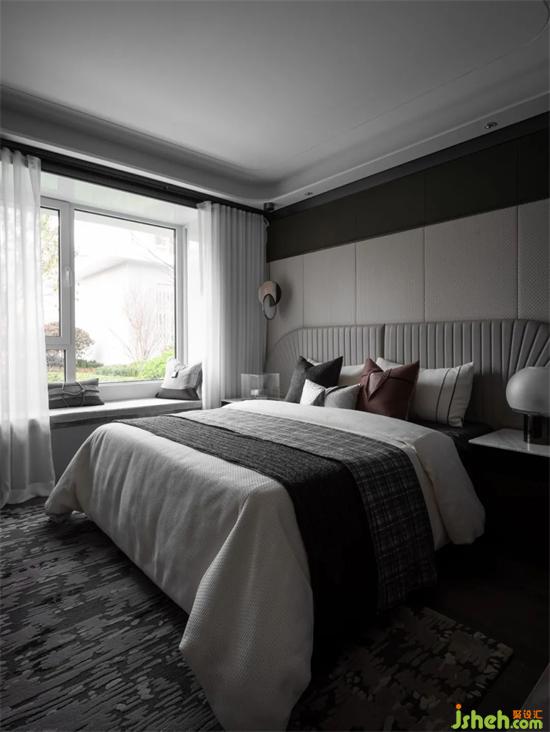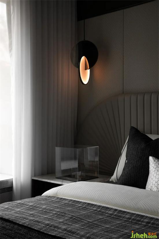 主卧设计运用深浅不一的灰色,营造出简洁、恬静的睡眠氛围,床头背景墙以不同色块的皮革组合,搭配线条流畅的扇形床头靠背,在线与面的交织,碰撞中,创造出和谐的空间秩序和韵律。