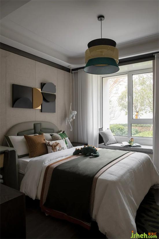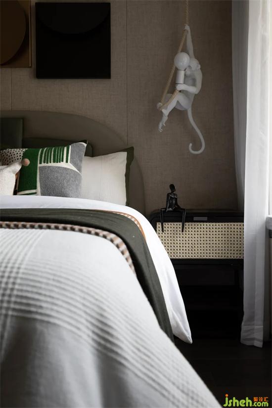 儿童房的设计中融入了动物元素,床头的吊灯,款式复刻了小猴子攀爬的姿势,活灵活现,萌态十足,再加上恐龙造型的玩偶和印有麋鹿图案的抱枕,一个生动有趣的童话世界跃然于眼前,与动物为伴,让孩子在居家的生活里也能感受到自然生趣,从而快乐地成长。