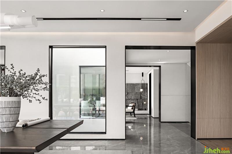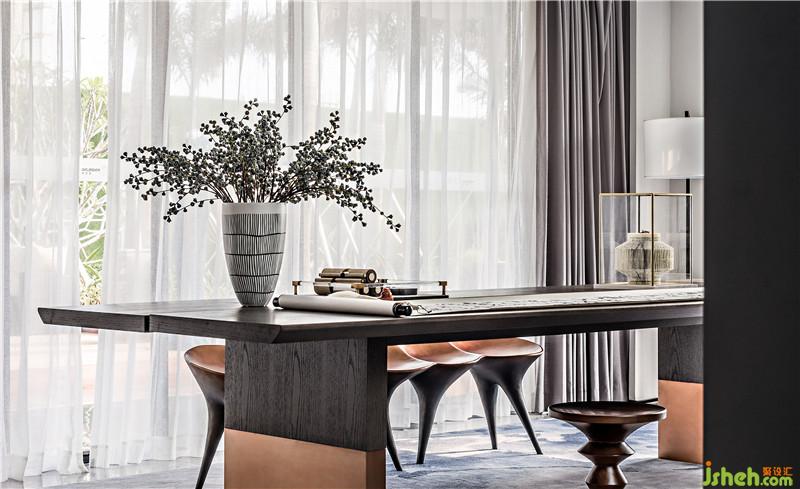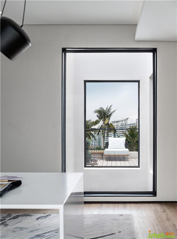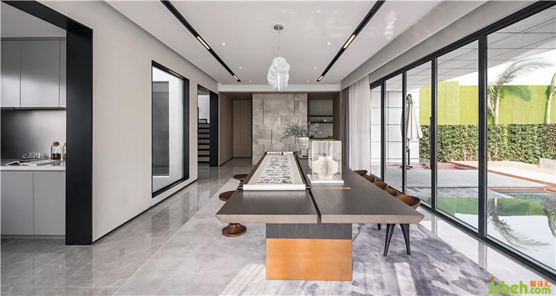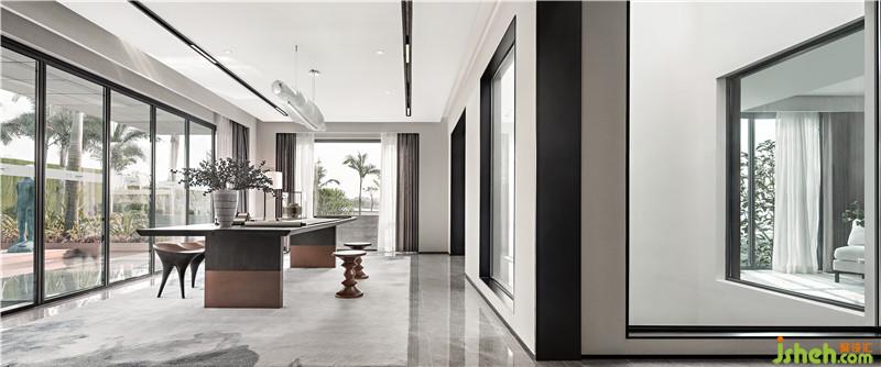 这是一个充满流动阳光的艺术空间。通过水汀石阶步入整座建筑,分隔内外的不是厚重的墙壁而是横贯书画厅的玻璃幕,能够将棕榈树的绿色和海口的日出日落映入厅内。