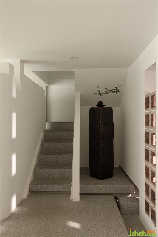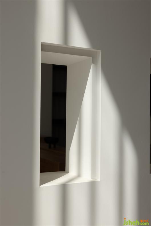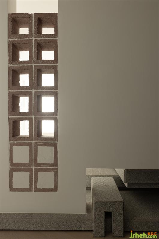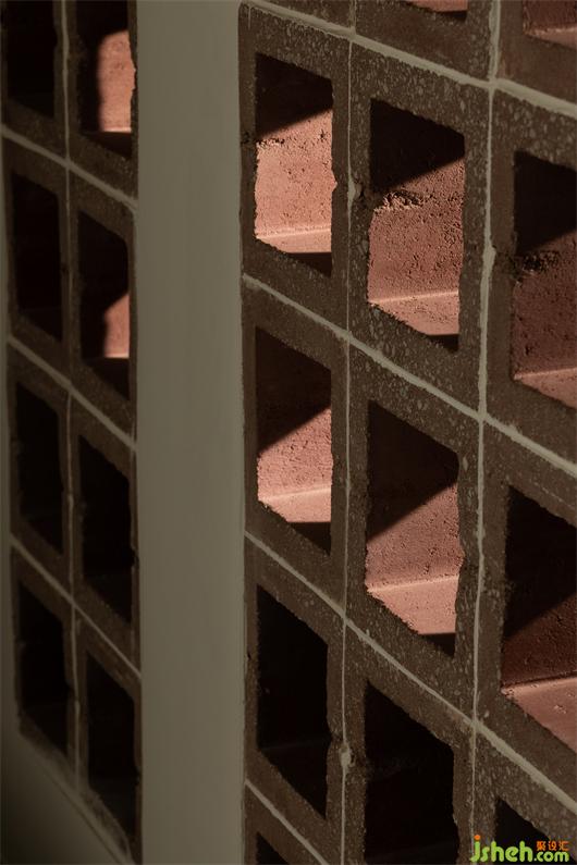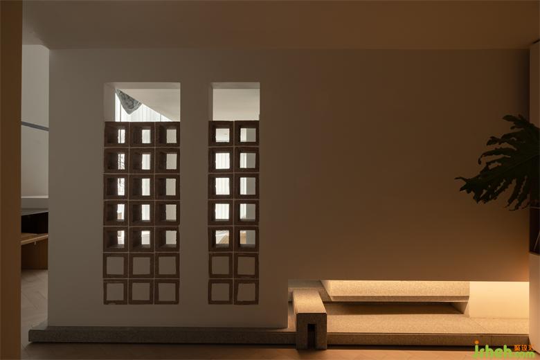 沿着曲面的门头走进,迎来满目砖红,阳光顺着砖格攀升进来,折射出红砖粗粒通透的质感。走进室内,光影交织,纵横错落,优雅的植物与柜体,串联起整个空间。