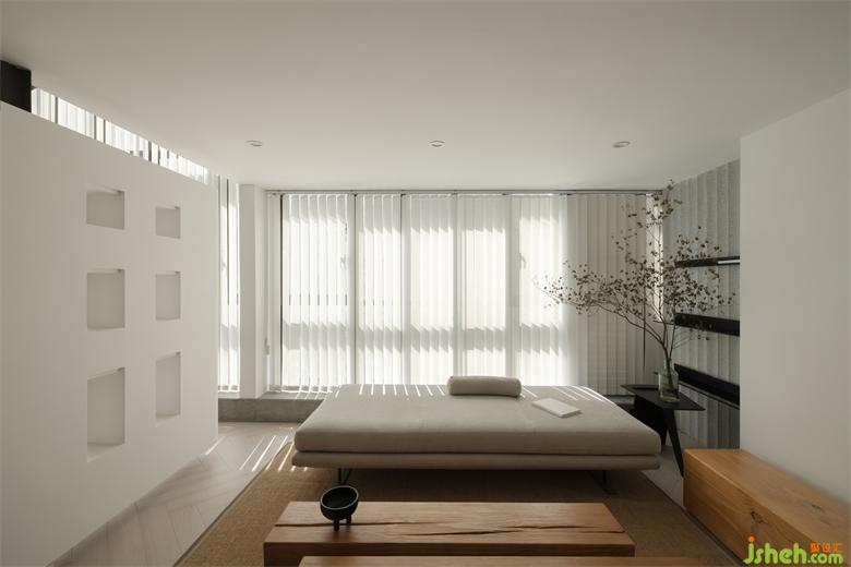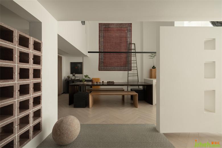 工作室设计师用一面上下悬空的矮墙做隔断,间隔会客区与谈单区。排列有序的窗格,隔而不断,让阳光与气流在空间中自由的流动。光影绰绰之间,是隐秘的窥探乐趣。