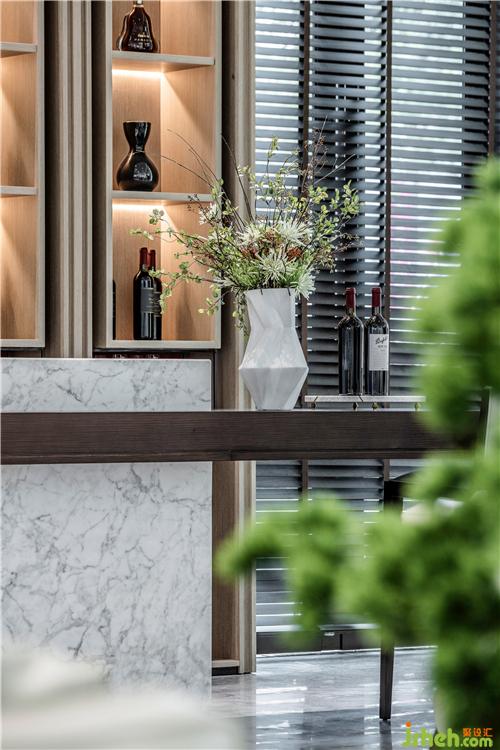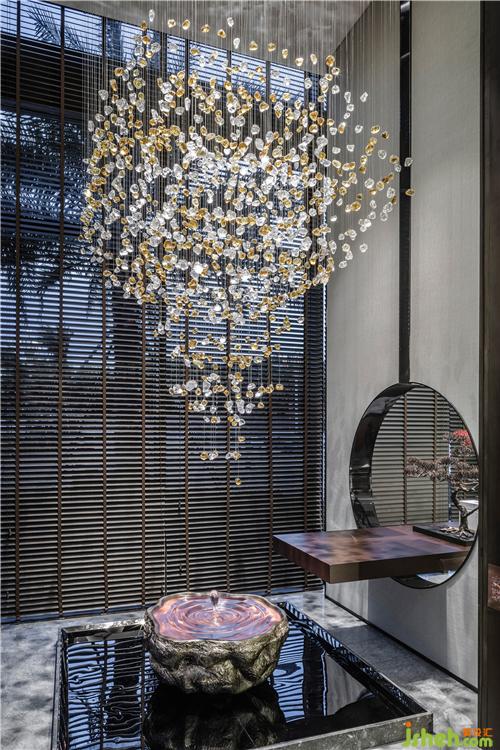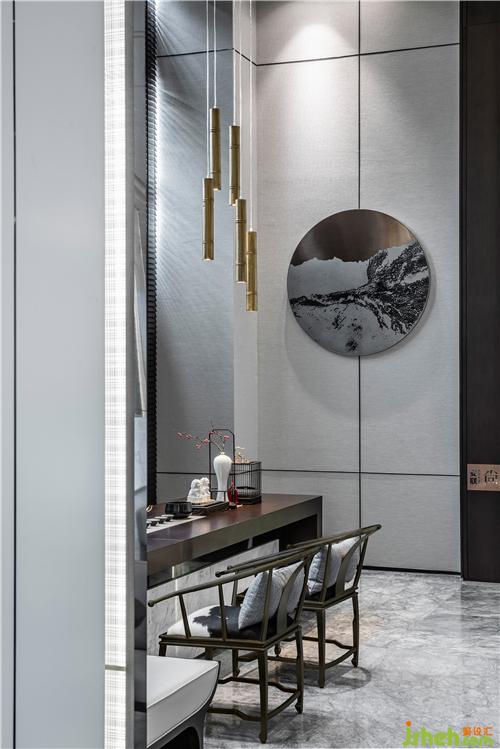 茶艺区以胡桃木材及大理石砖为主调,水滴状的玻璃挂饰以灵动之势缓缓落下,展现〝力〞与〝美〞的交互碰撞,使空间刚柔并济,体验高贵典雅的恢弘气势。