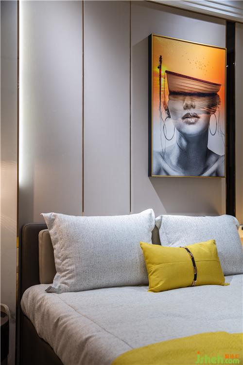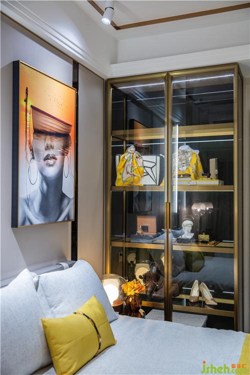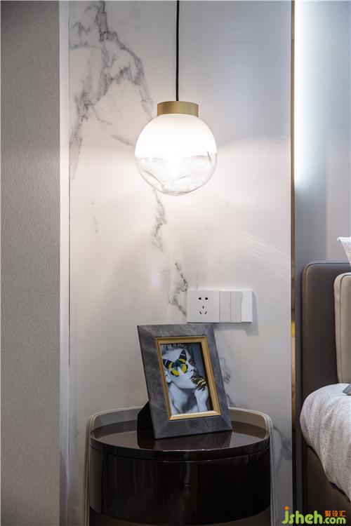 通透的玻璃衣柜,在灯光的照耀下,折射出明亮的光芒,精致与高级感触手可及。明朗的大理石、柔软的床品、具有艺术魅力的挂画和摆件,设计师以简洁有力的设计语言构建出的一个隔绝纷扰的宁谧之地。