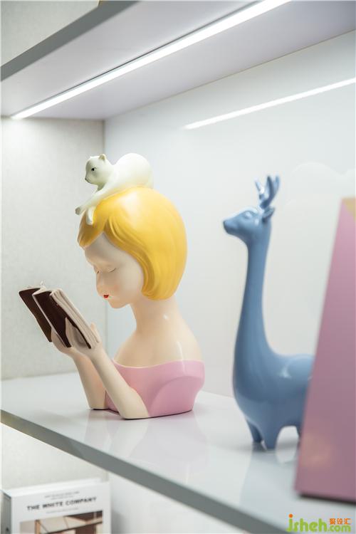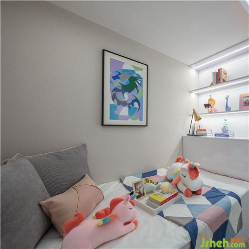柜板中间加以明亮灯光,为整体空间增加采光度,简约而明快。萌趣装饰画、可爱玩偶和粉色抱枕等饰品共同营造了一个童真又温馨的小世界。