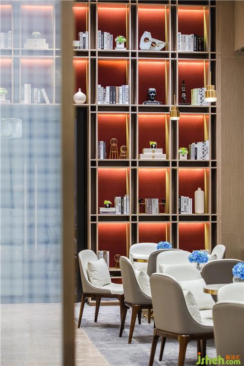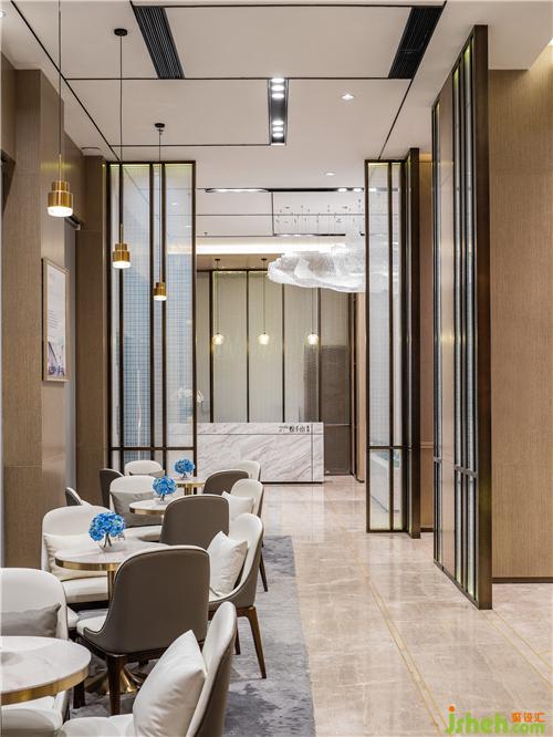 沙盘区饰以简约爵士白,金属线条将爵士白整齐分割,增加线条感。