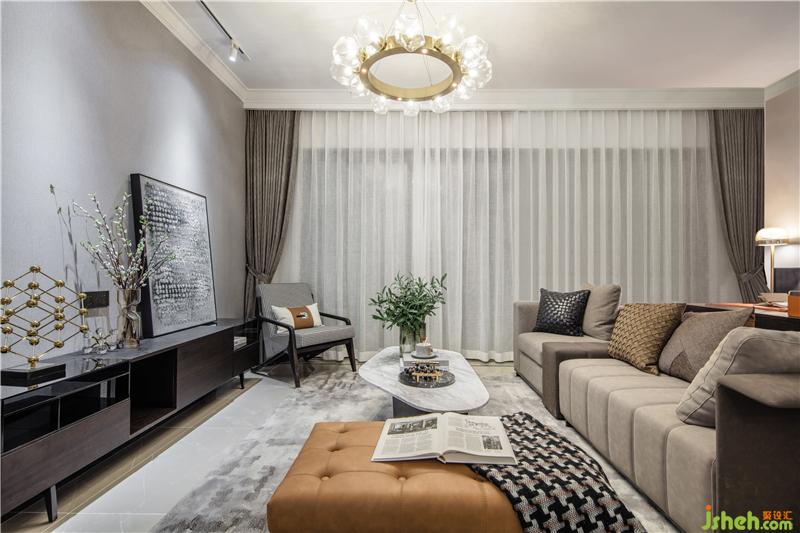金色圆形吊灯勾勒出别致的精巧,整体线条利落、干净,光与影设计了空间,整体以温馨米灰色为基调,样板房设计局部采用深咖色和胡桃木色色来增加空间的层次感,既简约,又不失个性。