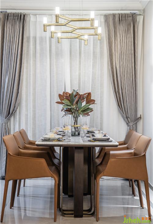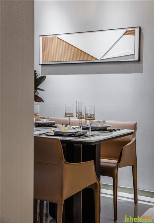 金属餐具与自然纹理的大理石形成对比,赠予空间一丝浪漫和仪式感,样板房设计马鞍皮材质的桌椅在简式线条烘托之下,深具质感。