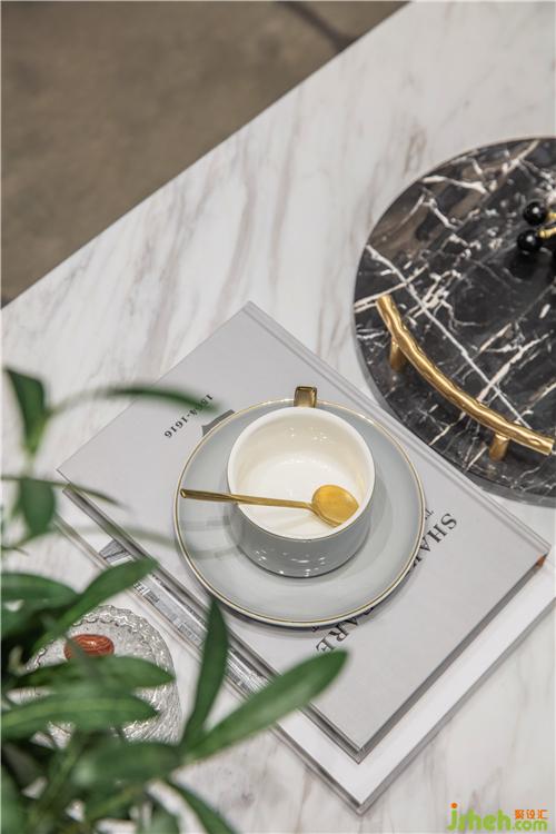 Metallic tableware forms contrast with the marble of natural grain, give a space a romance and ritual feeling, the desk and chair of horse saddle leather material is under foil of simple type line, have qualitative feeling deeply.