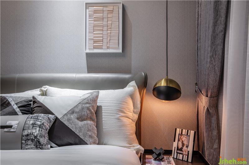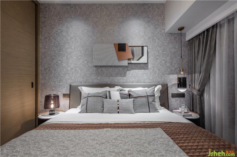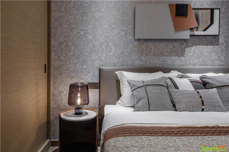 In master bedroom, stylist USES rice gray to give priority to tonal collocation walnut lubricious furniture, low-key and inside collect, the art that the head of a bed joins together hangs a picture, with pure contrast color piece, rational line draws the outline of the power aesthetic feeling that gives a space.