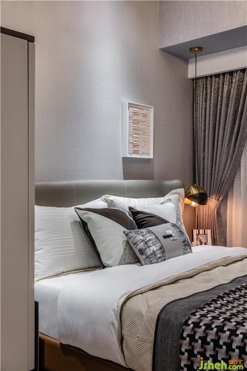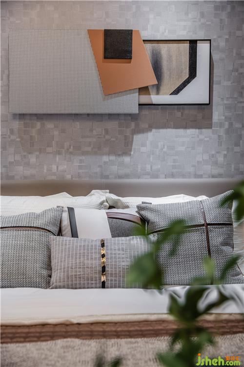 在主卧中,设计师用米灰色为主色调搭配胡桃木色家具,低调而内敛,床头一幅拼接的艺术挂画,用纯粹的对比色块,理性的线条勾勒出空间的力量美感。