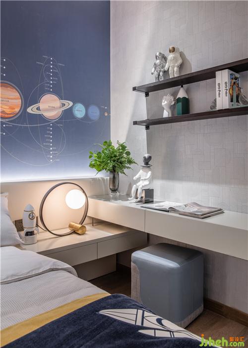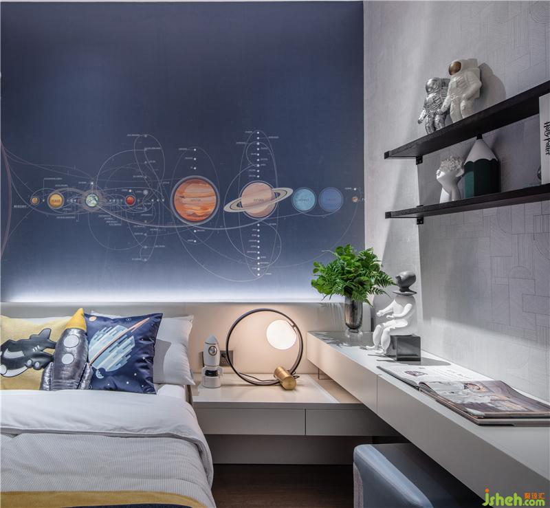 星空、火箭和宇航员,这是专门为具有梦想成为宇宙飞行员的小主人精心打造的,从抱枕、陈列品到灯具、到房间壁纸的选择,设计师为小主人打造了一个浩瀚的宇宙空间。