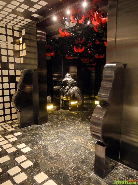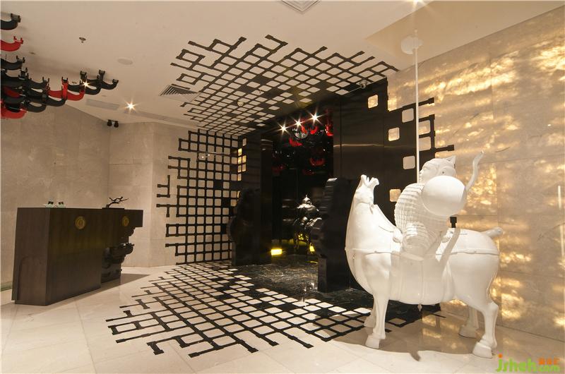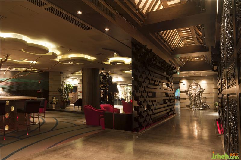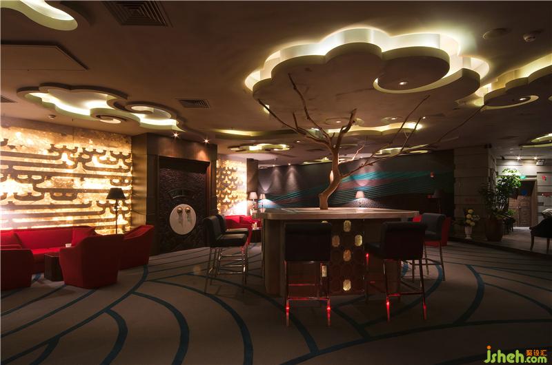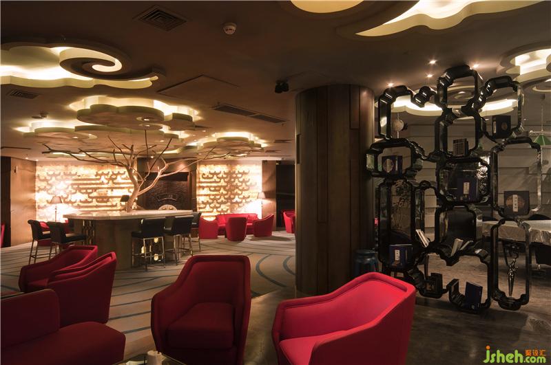 说到岭南文化,与古老的南越国文明有着不可分割的联系。越王包厢的主色调为红色,象征着激情,烈火和力量。挂毯的图案由贵气的牡丹花演变而来。图案被切割成不同部分置于墙上的手法打破了整幅图的墨守成规。配合墙上一幅气势磅礴的龙图腾,展示出一股王者的霸气,而龙床前作装饰的薄纱帐又散发出一丝女性独有的温柔和飘逸。越王包厢的设计平衡了阳刚之气与阴柔之美,把主题应有的大气和典雅恰到好处地表现出来。会所设计