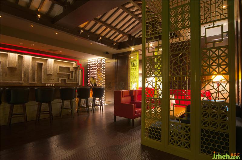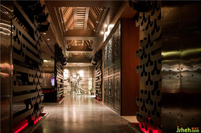 项目的设计由不同的主题部分构成,巧妙地把中国岭南文化和西方现代设计手法,古典与现代的文化元素糅合在一起,赋予了空间一种脱俗的大气与优雅。项目的门厅主要以斗拱作为装饰。从正门口望进场内,墙体与地面的图案巧妙地形成一个圆形,吸引着客人去一探究竟。过了门厅便是大厅。大厅由越王包厢,威士忌吧,红酒吧,雪茄吧等部分组成,每个部分的设计灵感都来源于不同的主题。