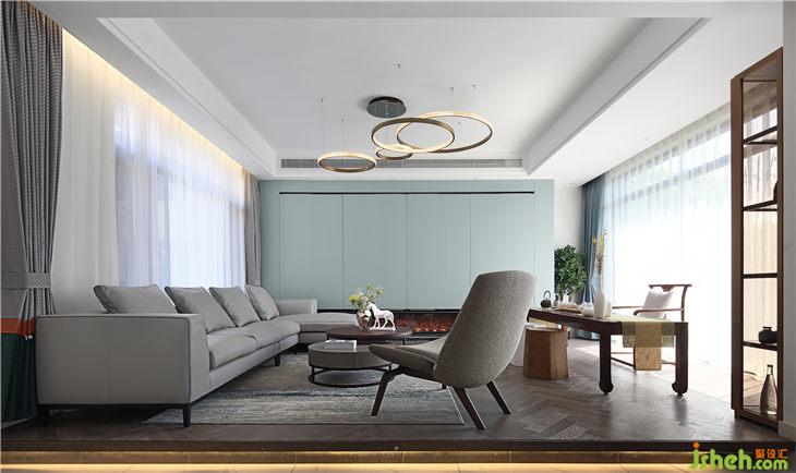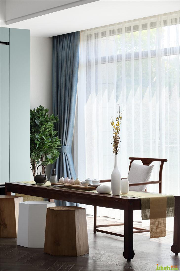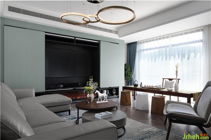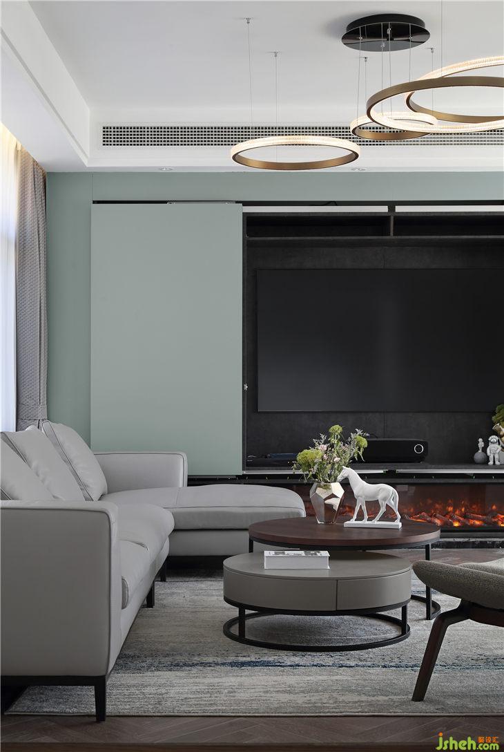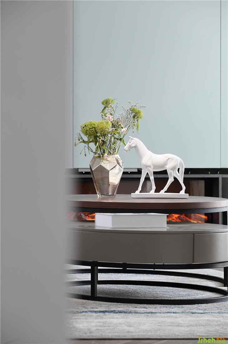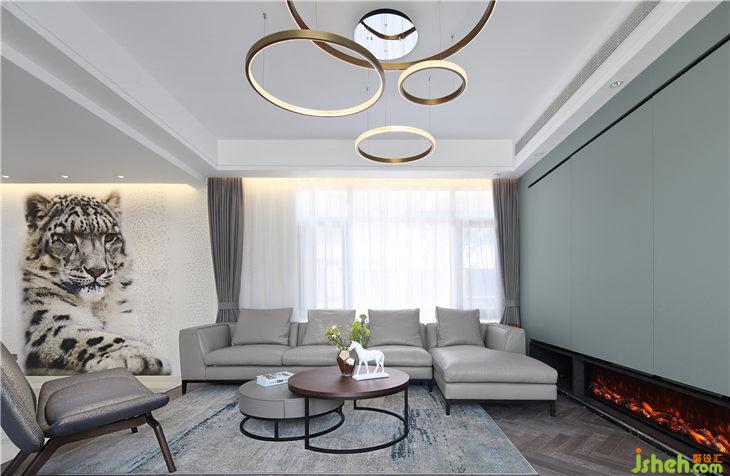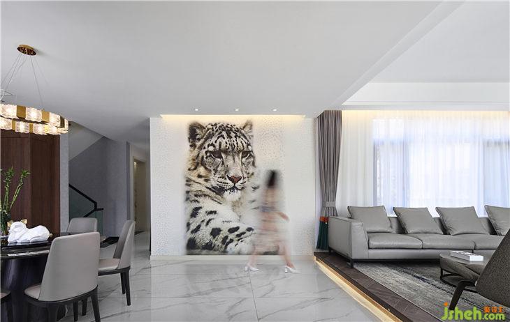 门厅的小豹子,是花了很长时间的才选到的,让整个空间灵气了许多并又可爱了些许。往左边上地台就是客厅,正面隐藏式组合柜为空间整理出一个十分简约干净的画面,为了让整个空间干净清爽,我寻找了一种类似于巴士门的五金件,让组合柜是全自动的高科技,轻轻按下,家庭影院的就藏在里面。跟别人不一样的背景墙,因为我们的背景是阳光。茶桌背后的大落地窗,让阳光肆无忌惮地撞进来。让她窝在沙发里,听窗外的花草浅唱。
