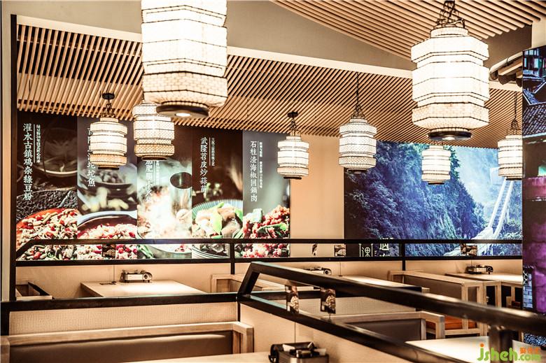 餐厅设计以一排12米长的连廊及9米长的明档为主景的B区,将遇东岚的菜名罗列在明档之上,以原木色实木为基础,连绵起伏的立体造型尤为显眼。连廊配上小青瓦,更凸显 出少数民族地区特有的文化建筑。